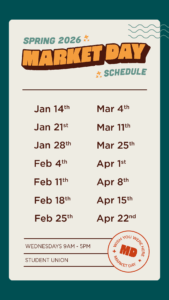 From 9 AM – 5 PM (8 AM – 9 AM setup) each Wednesday, students, and vendors can reserve a 10×10 space on the Union’s outdoor South Patio, along with a table (6′ x 30″) and two chairs from which to promote their product or organization. Although Market Days are held on an uncovered portion of the patio, organizations may bring their tents by obtaining advance permission from the Market Day Coordinator.